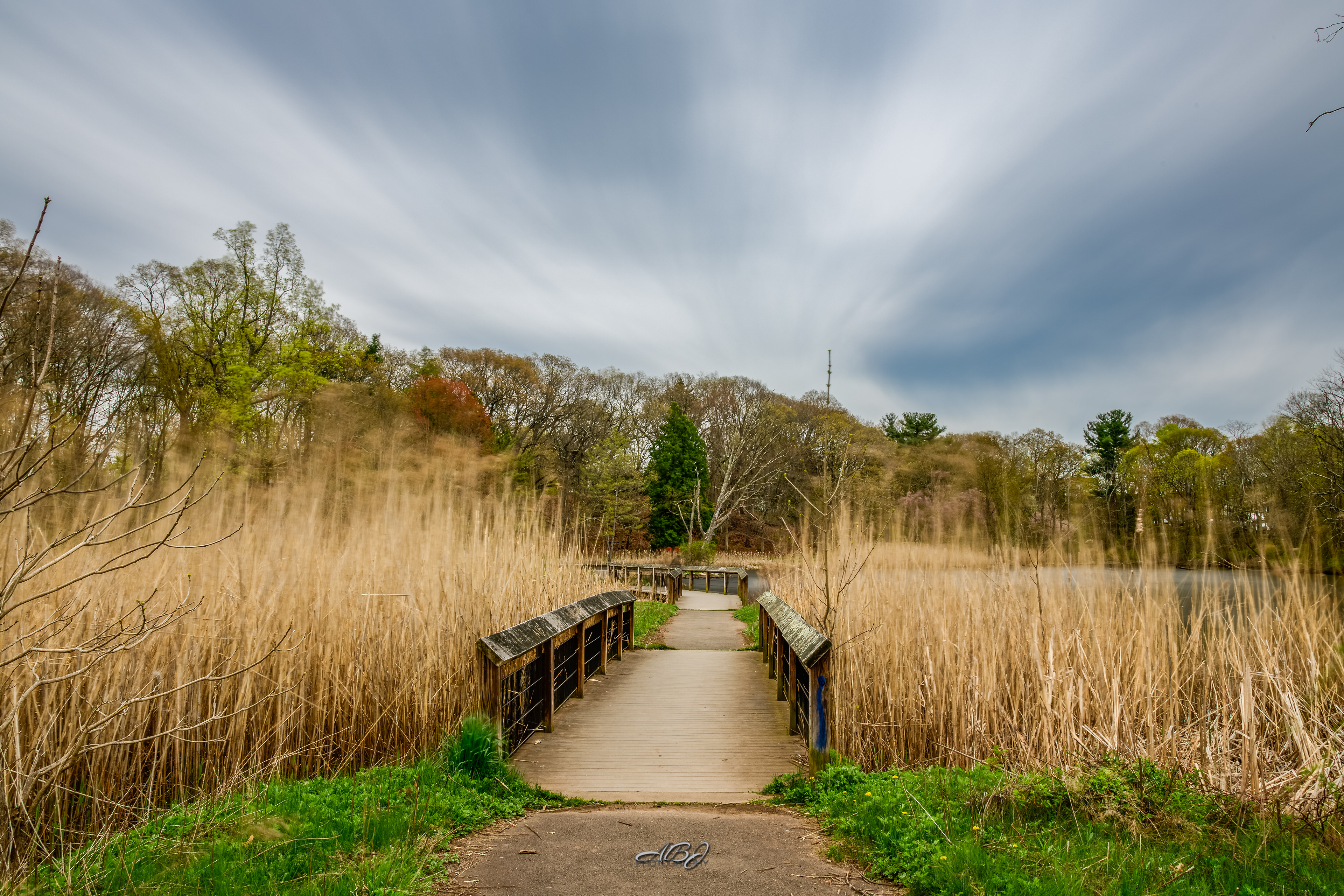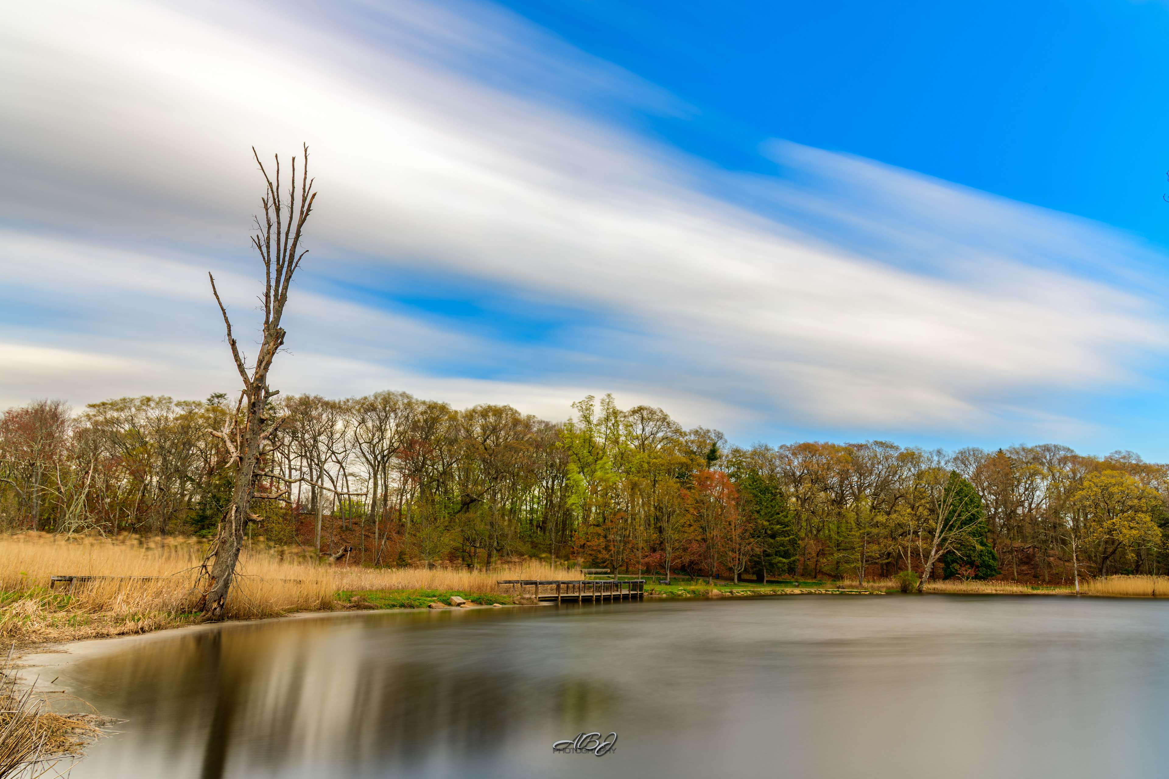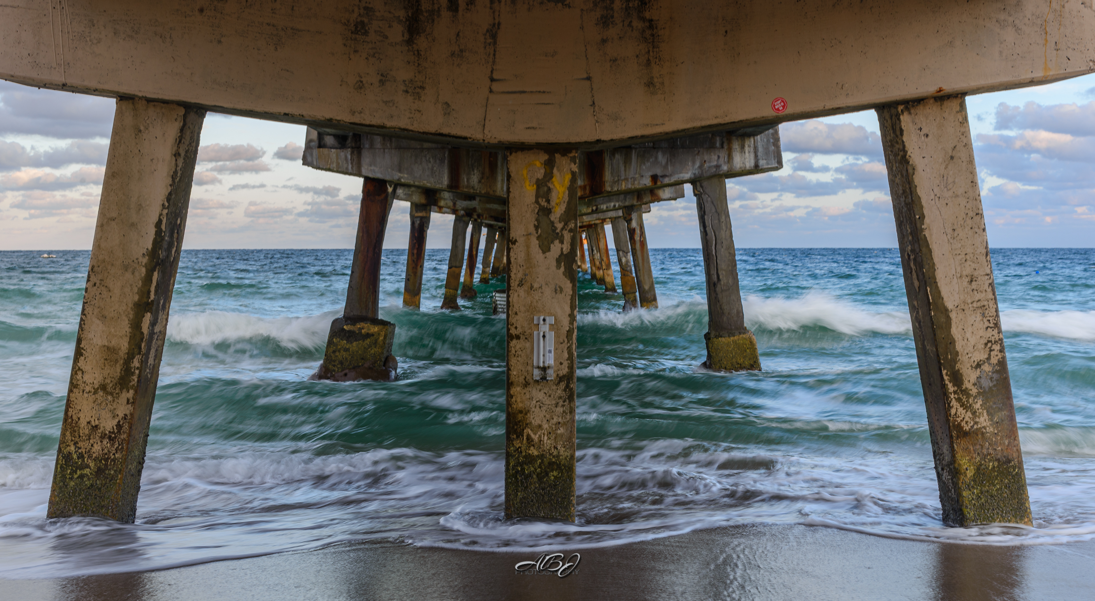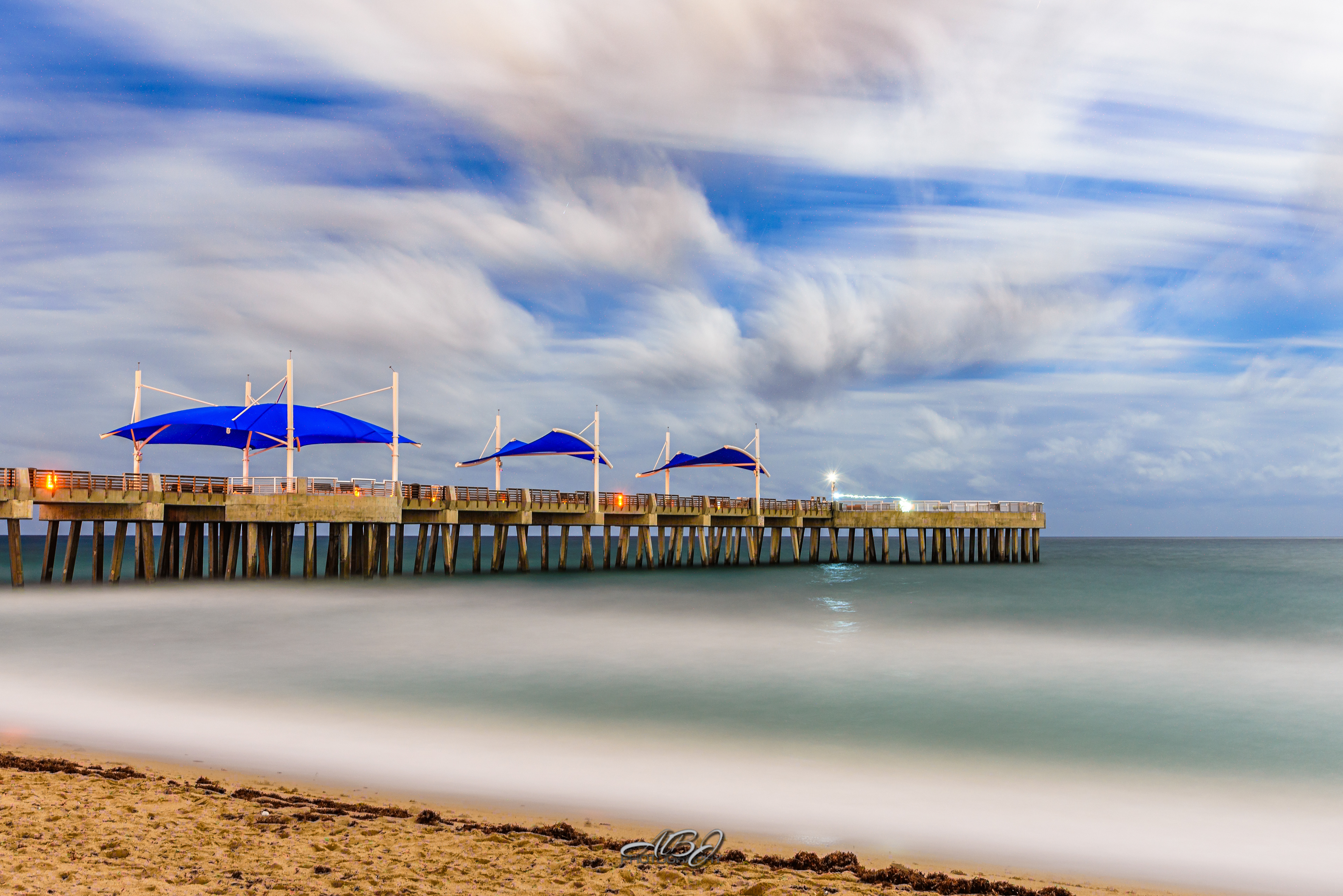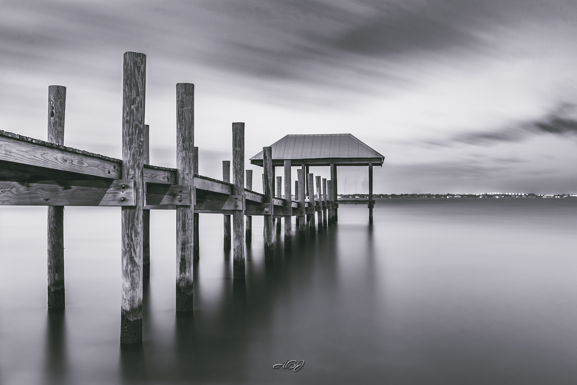 "Fishing Pier II" - Clouds streaking above the fishing pier with still waters below.
